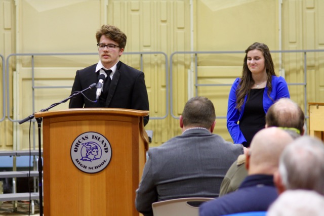 The Orcas School music program bids farewell to two graduating seniors this year, a Band percussionist, Liam Griskey-Watson, and Strings violinist, Joanne Mietzner. Both have been stellar musicians. Joanne played in the San Juan Music Educators Association (SJMEA) Senior Honor Orchestra. She also played in the Orcas High School Strings group that won first place at the Senior Large Group Orchestra Contest this year, beating groups from much larger schools. Fellow senior Liam won a coveted spot in the Pacific Lutheran University Northwest High School Honor Band earlier this year, together with Tim Jenson and Ewan Lister.