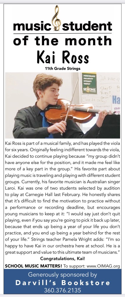 The Music Student of the Month series recognizes Orcas Island Public School musicians who work hard at their musical skills and whose love of music is an inspiration to their fellow student musicians. Thank you so much to the Orcas Island businesses who are sponsoring this monthly series throughout the 2019-20 school year that recognizes the efforts of student musicians and the value of school music!