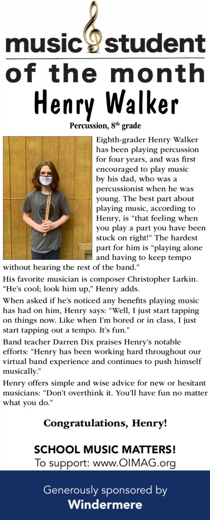 The Music Student of the Month series recognizes Orcas Island Public School musicians who work hard at their musical skills and whose love of music is an inspiration to their fellow student musicians. Thank you so much to the Orcas Island businesses who are sponsoring this monthly series throughout the 2020-21 school year that recognizes the efforts of student musicians and the value of school music!