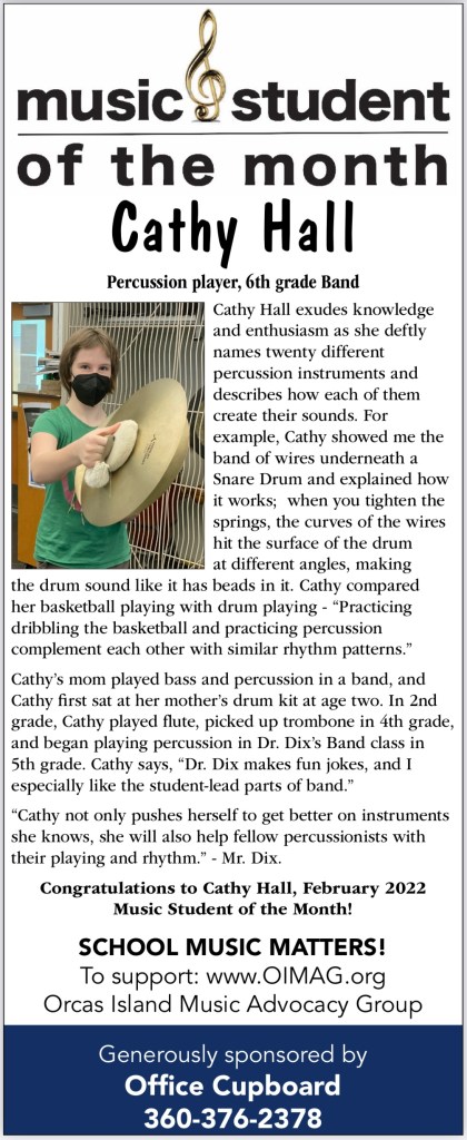 The Music Student of the Month series recognizes Orcas Island Public School musicians who work hard at their musical skills and whose love of music is an inspiration to their fellow student musicians. Thank you so much to the Orcas Island businesses who are sponsoring this monthly series throughout the 2021-22 school year that recognizes the efforts of student musicians and the value of school music!