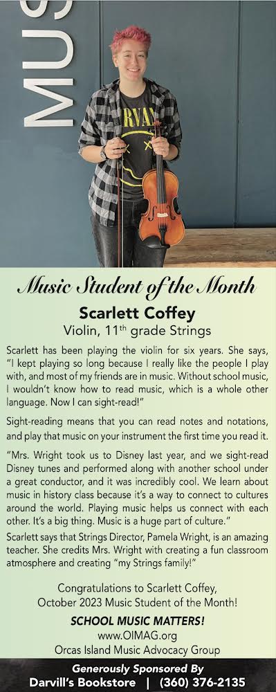 The Music Student of the Month series recognizes Orcas Island Public School musicians who work hard at their musical skills and whose love of music is an inspiration to their fellow student musicians. Thank you so much to the Orcas Island businesses who are sponsoring this monthly series throughout the 2023-24 school year that recognizes the efforts of student musicians and the value of school music!