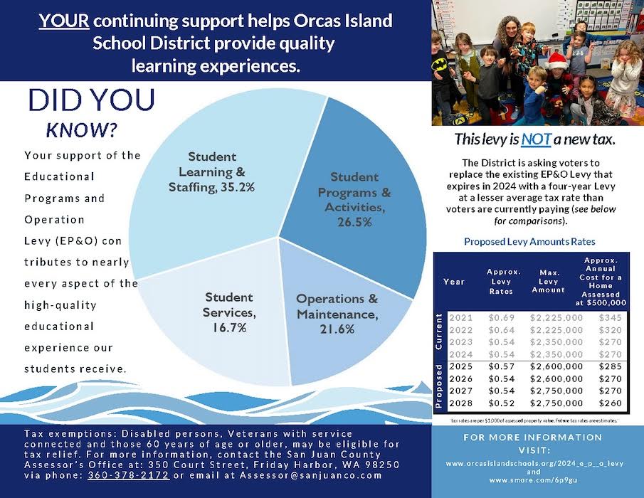 The Music Advocacy Group (MAG) encourages all voters on Orcas island to vote “yes” in support of the EP&O school levy renewal this February. Voting “yes” does not increase your taxes – the levy amount maintains current costs and even presents a slight decrease over the next four years. Voting “yes” does ensure that students in our schools continue to receive the resources and instruction they need in order to experience and excel in music and the arts from an early age.