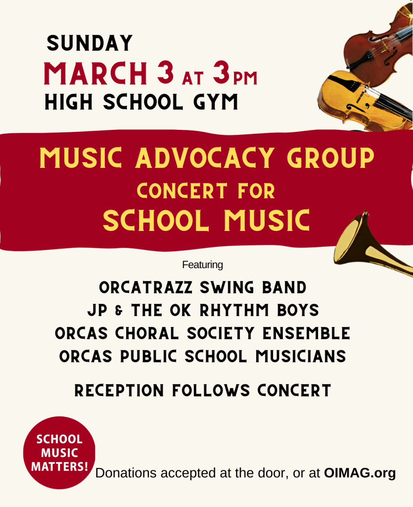 Donations to MAG will be accepted at the door, online at OIMAG.org, or via check payable to Music Advocacy Group, P.O. Box 1171, Eastsound, WA 98245.
