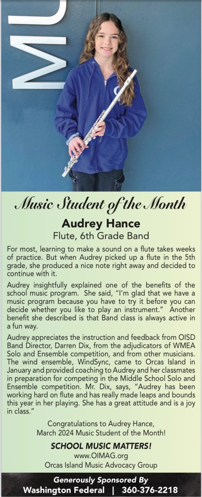 This young flutist is glad for the opportunity to try out a musical instrument as part of the school music program when she was in 5th grade. For many Orcas Island public school students, this is where they first learn to play an instrument. This February and March, Audrey has benefited from professional feedback, thanks to participation in in-school workshops and regional competitions in the school music calendar. Darren Dix, OISD Band Director, notes that Audrey’s hard work and attitude have helped improve her playing by leaps and bounds. Congratulations to our March honoree, Audrey!