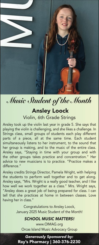 The Music Student of the Month series recognizes Orcas Island Public School musicians who work hard at their musical skills and whose love of music is an inspiration to their fellow student musicians. Thank you so much to the Orcas Island businesses who are sponsoring this monthly series throughout the 2024-25 school year that recognizes the efforts of student musicians and the value of school music!