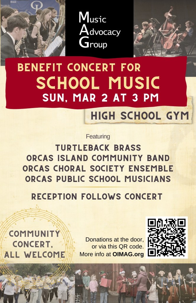 All are invited to attend the March 2nd MAG Benefit Concert. Admission is by optional donation, with all proceeds going to the Music Advocacy Group. Donations will be accepted at the door, online at OIMAG.org, or via check payable to the Music Advocacy Group, P.O. Box 1171, Eastsound, WA 98245.