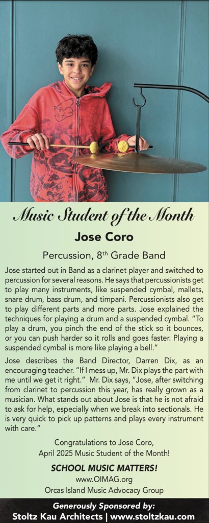 The Music Student of the Month series recognizes Orcas Island Public School musicians who work hard at their musical skills and whose love of music is an inspiration to their fellow student musicians. Thank you so much to the Orcas Island businesses who are sponsoring this monthly series throughout the 2024-25 school year that recognizes the efforts of student musicians and the value of school music!