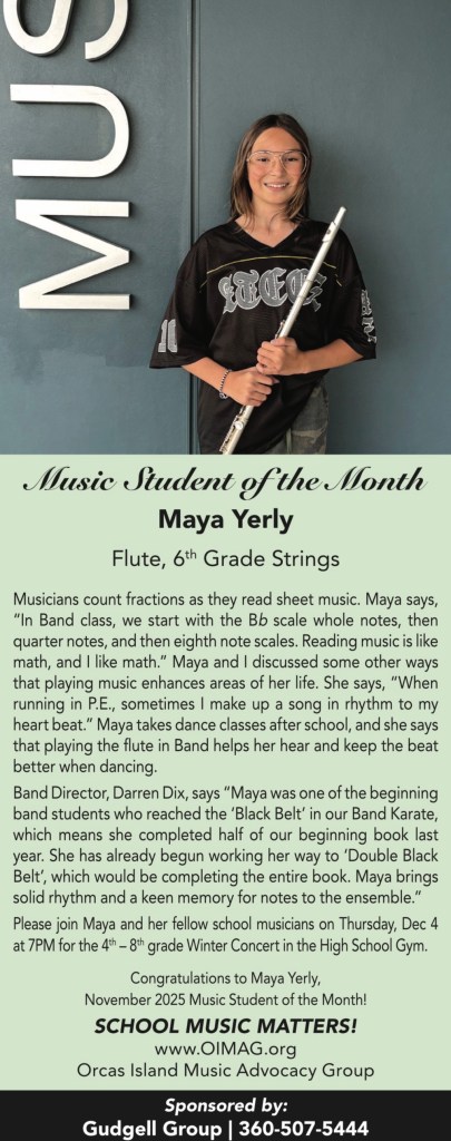 The Music Student of the Month series recognizes Orcas Island Public School musicians who work hard at their musical skills and whose love of music is an inspiration to their fellow student musicians. Thank you so much to the Orcas Island businesses who are sponsoring this monthly series throughout the 2024-25 school year that recognizes the efforts of student musicians and the value of school music!