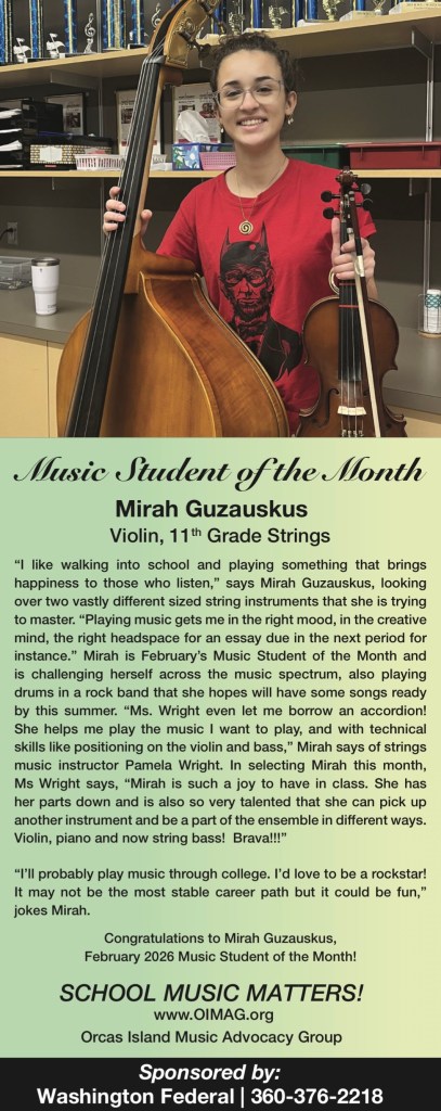 The Music Student of the Month series recognizes Orcas Island Public School musicians who work hard at their musical skills and whose love of music is an inspiration to their fellow student musicians. Thank you so much to the Orcas Island businesses who are sponsoring this monthly series throughout the 2024-25 school year that recognizes the efforts of student musicians and the value of school music!