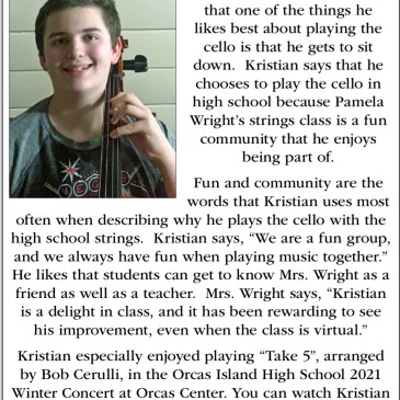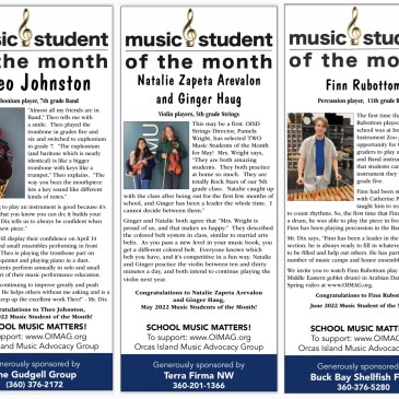 We hope these little stories give you a glimpse of the outstanding musicians the public school music program is nurturing. A belated but heartfelt congratulations to these amazing Orcas Island student musicians—Theo Johnston (April), Natalie Zapeta Arevalon and Ginger Haug (May), and Finn Rubottom (June), who helped us close out the 2021-22 school music program! … More April/May/June 2022 Music Students of the Month